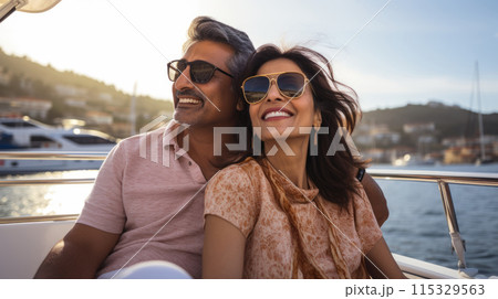 Smiling middle aged indian american couple enjoying sailboat ride in summer