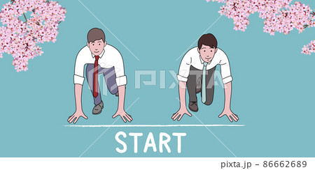 背景なし スタートのポーズをとるビジネスマンの男性2人、背景に桜