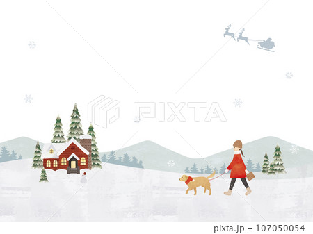 雪のクリスマスにゴールデンレトリバーの散歩をする女性水彩画
