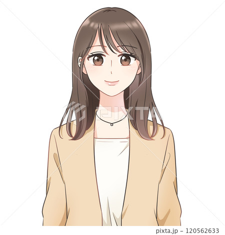 オフィスカジュアルスタイルの女性 指さし にっこり笑顔