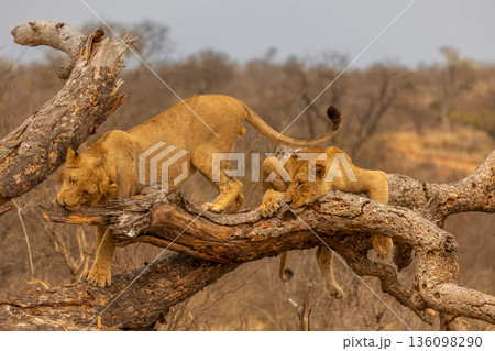 Lions Standing on a Fallen Tree in Kruger National Park, South Africa