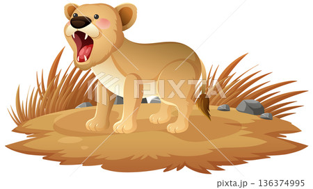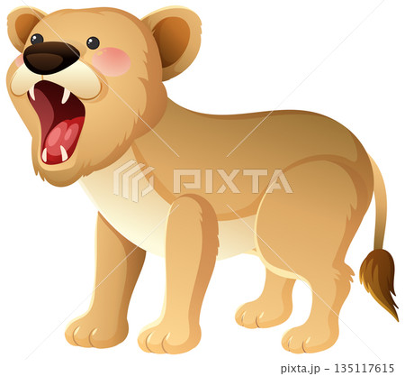 Cute lion cartoon character singing while holding a microphone. Adorable animal illustration in vector style, expressing joy and performance, suitable for children content, music themes, entertainment