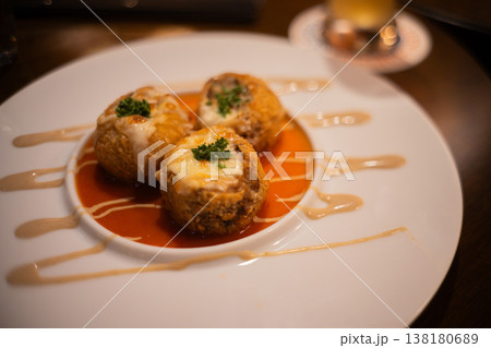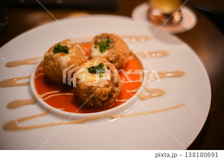 レストランのトマトソースのおいしそうなチーズのコロッケ