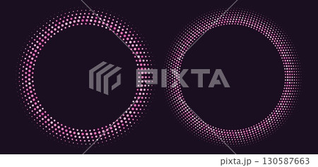 Pink halftone frames, retro circle borders, round pattern with dots, radial disco luxury design element.