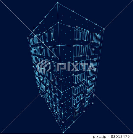 The contour of a multi-storey building made of blue lines on a dark background with glowing lights. 3D. Vector illustration