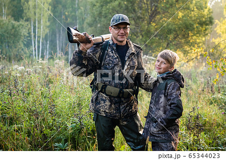 Father teaching his son about gun safety and proper use on hunting in nature.