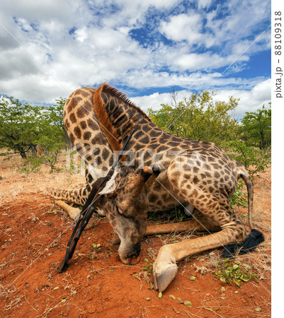 Traditional hunting trophy of giraffe with gun after an official hunt in Africa.