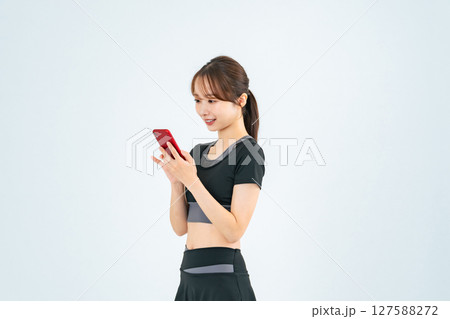 スマホを使うスポーツウェアの女性の全身写真
