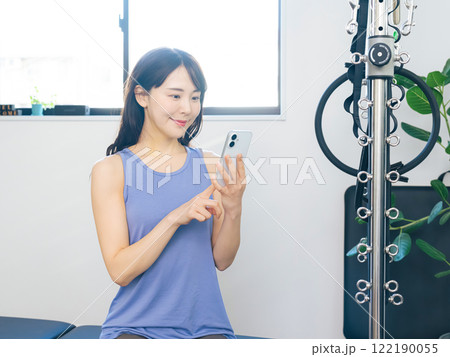 スポーツジムでスマホを使う女性