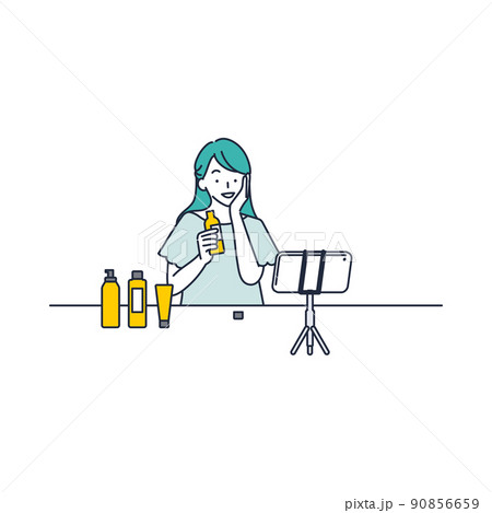 化粧品をライブコマースで宣伝販売する女のイラスト素材