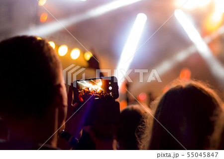 People taking photographs with smart phone during a music festival. Fans enjoying rock concert with light.