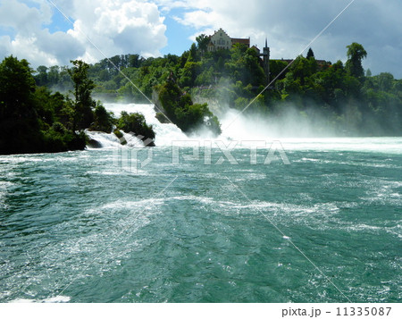 勢いよく流れるドイツとスイスの国境を流れるライン川の滝