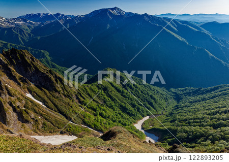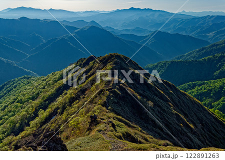 新緑の谷川岳・西黒尾根の登りから見る朝の上州武尊山