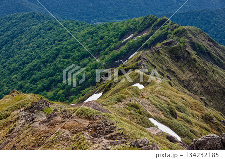 西黒尾根・ラクダの背を行く登山者と谷川岳山頂