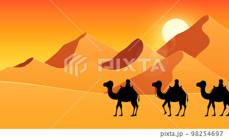 砂漠の風景イラスト_夕焼けとラクダのシルエット_16:9