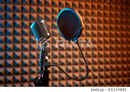 Retro microphone and pop filter on acoustic foam panel background
