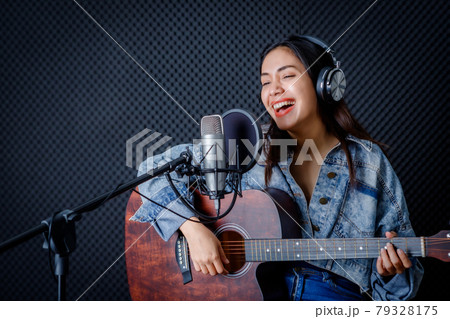 Happy cheerful pretty smiling of portrait a young Asian woman vocalist Wearing Headphones with a Guitar recording a song front of microphone in a professional studio