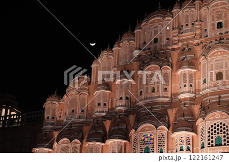 ライトアップされた夜のハワーマハルと月