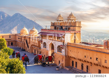Elephant riders in Amber Fort, famous tourist attraction of Jaipur, India