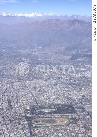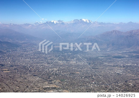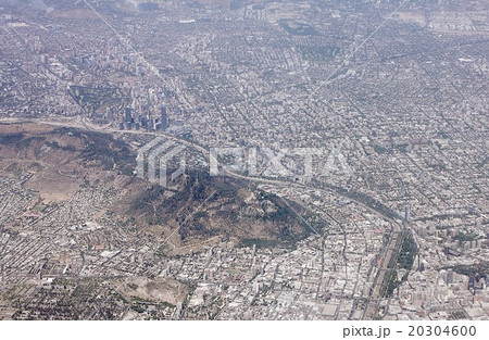 上空から望む南米チリの首都サンチアゴ市のパノラマ