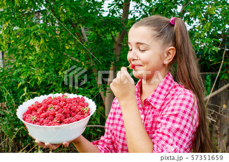 teen girl holding a bowl of raspberries in the