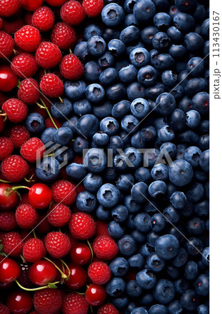Assortment of raspberries and blueberries arranged to form a pattern.