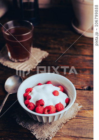 Bowl of Summer Dessert with Ripe Raspberries and Greek Yogurt
