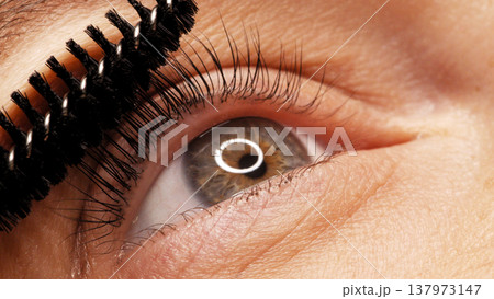Making makeup in a beauty salon. Applying black mascara to the eyelashes with a makeup brush. Close-up of a woman's eye. Lengthening of the eyelashes after lamination.