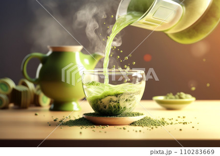 Matcha latte, fresh matcha tea, green tea pouring on a glass of milk and whipped cream on wooden table.