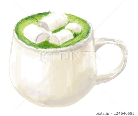 マシュマロがのったホット抹茶ラテの水彩イラスト