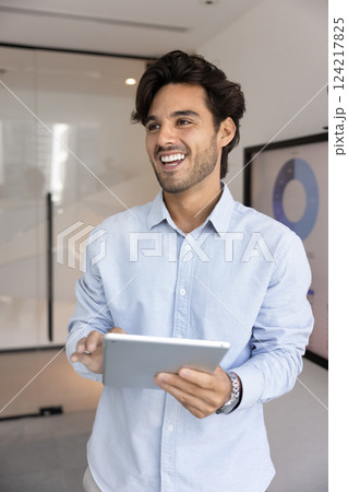 Positive attractive Hispanic man with stubble wearing casual shirt