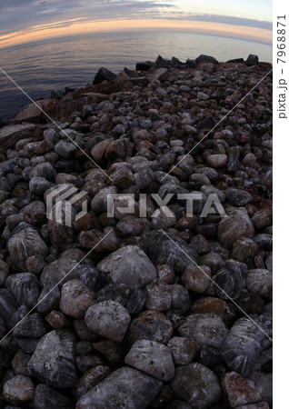 Stone coast of Ladoga lake at sunset