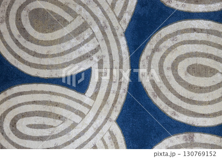 Abstract blue textile with white concentric spiral pattern, rope coil motif