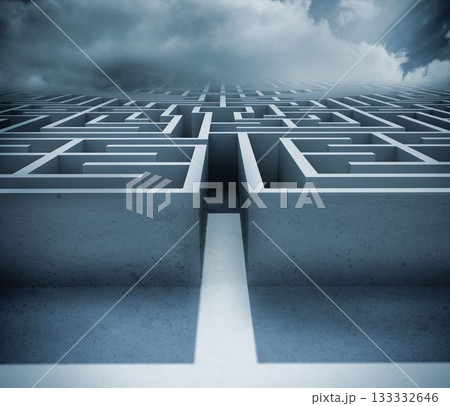 Digitally generated big 3d maze under clouds