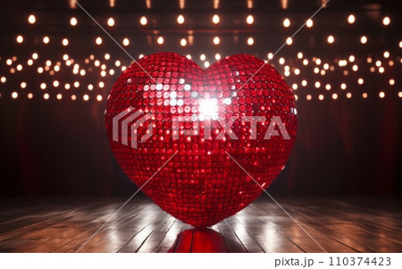 Red heart on a wooden floor with lights in the background. 3d rendering