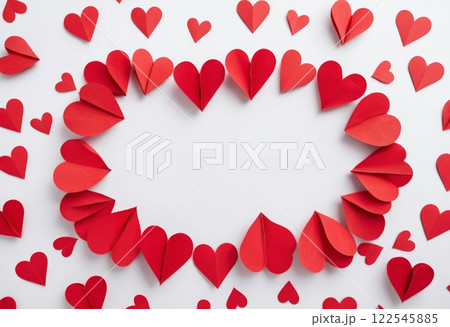A delightful display of red paper hearts on a white background, ideal for romantic themes, DIY crafts, and Valentine's Day decorations
