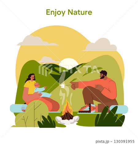 Family time around a campfire with mountains in the background. Parents smile while roasting marshmallows, creating a joyful atmosphere. Ideal for outdoor and family themes.