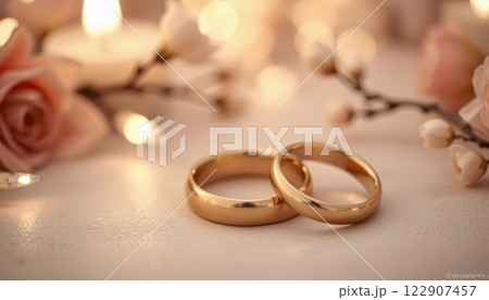 Close up of two polished, glowing gold bands stacked together, symbolizing love and unity in a romantic setting.