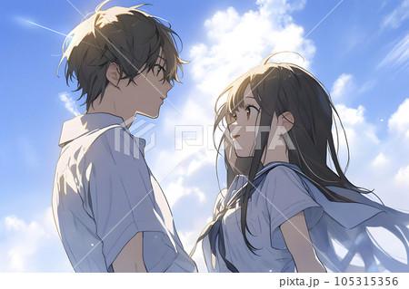 青空の下、見つめ合う男女2人の学生(Generative AI)