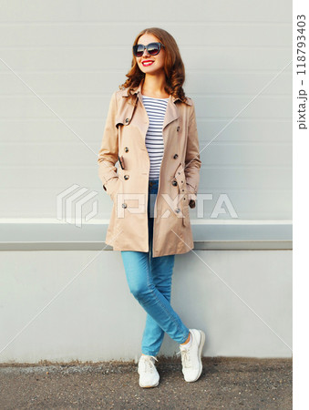 Pretty smiling woman stands wearing a coat and black sunglasses over grey background
