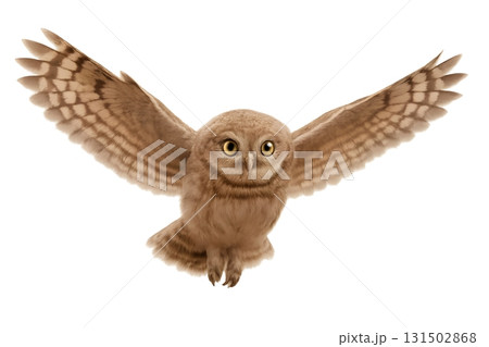 Fluffy owlet in mid flight with wide wings and bright yellow eyes, isolated on white background.