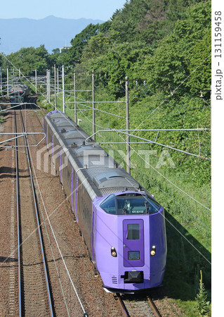 札幌から観光客を乗せて富良野へ向かうラベンダー編成の特急「フラノラベンダーエクスプレス」