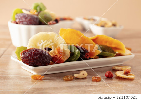 Dried tropical fruits, nuts, and raisins isolated on white.