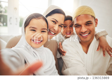 Selfie, Islam and happy family in living room for Eid with mom, dad and kids with home culture in Indonesia. Muslim man, woman in hijab and children in portrait to celebrate Ramadan on sofa together.