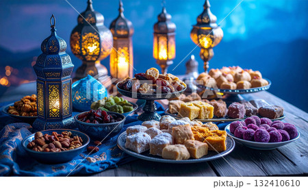 夜に灯るアラビア風ランタンと伝統的なスイーツ(ラマダンのイフタール)