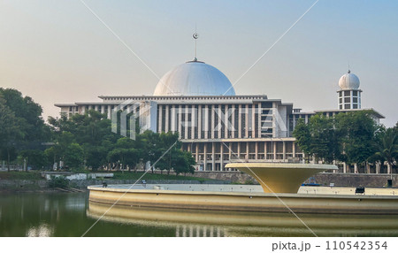 インドネシアのジャカルタのイスティクラル・モスクと池と噴水