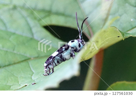 葉の上にいるラミーカミキリムシ