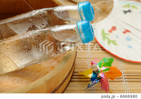 冷えたラムネ、青の背景に日本の伝統的な夏の飲み物。