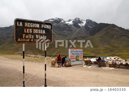 ペルー ラ・ラヤ峠 標高4335m地点の標識と露店