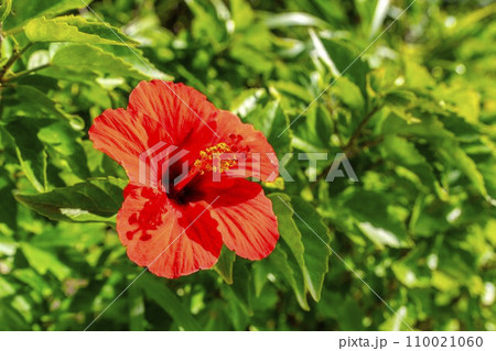 道端に咲く赤いハイビスカス 沖縄県名護市